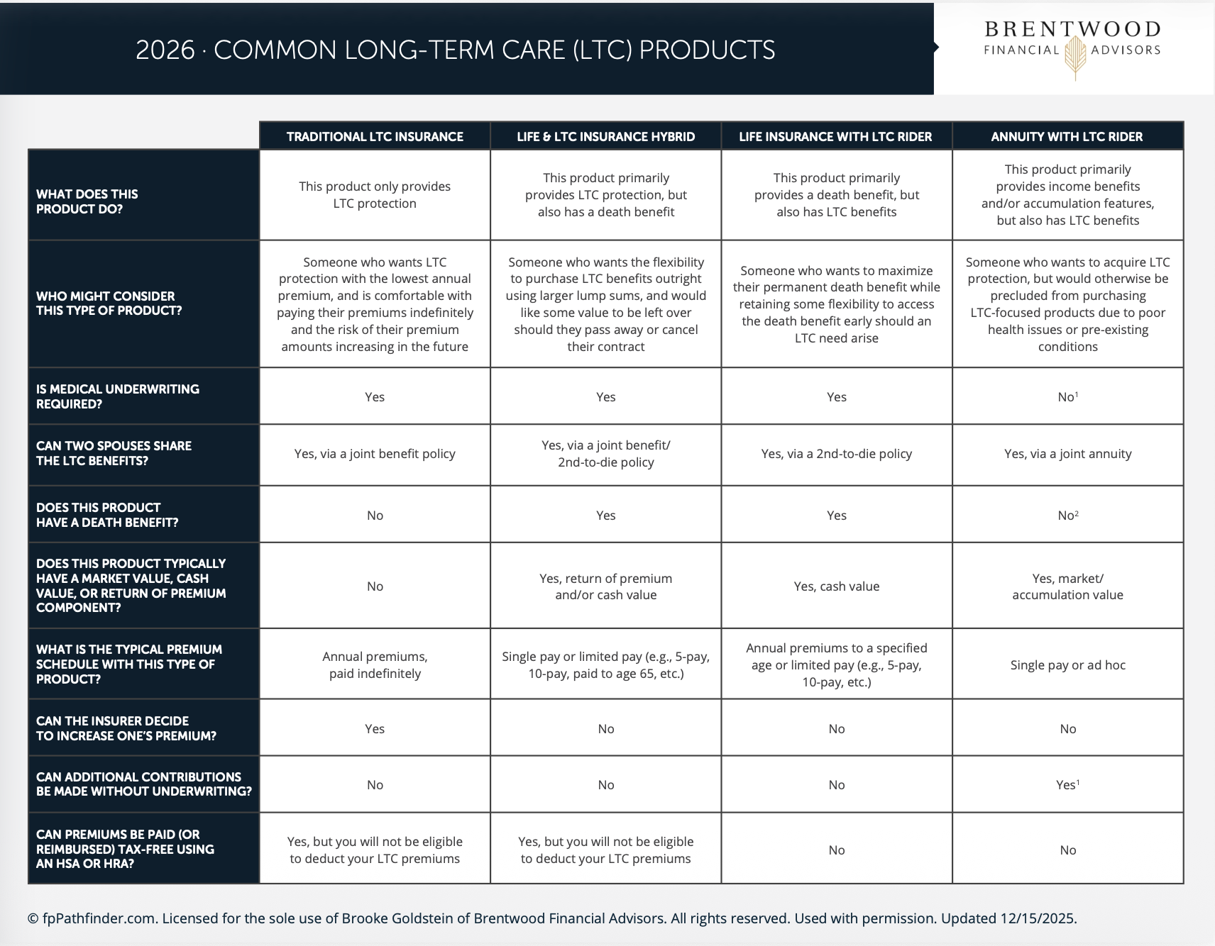 In addition to traditional LTC plans, there are more flexible "asset-based" or Hybrid options to consider. Take a look at the chart for an overview of products available and the nuances of each option.